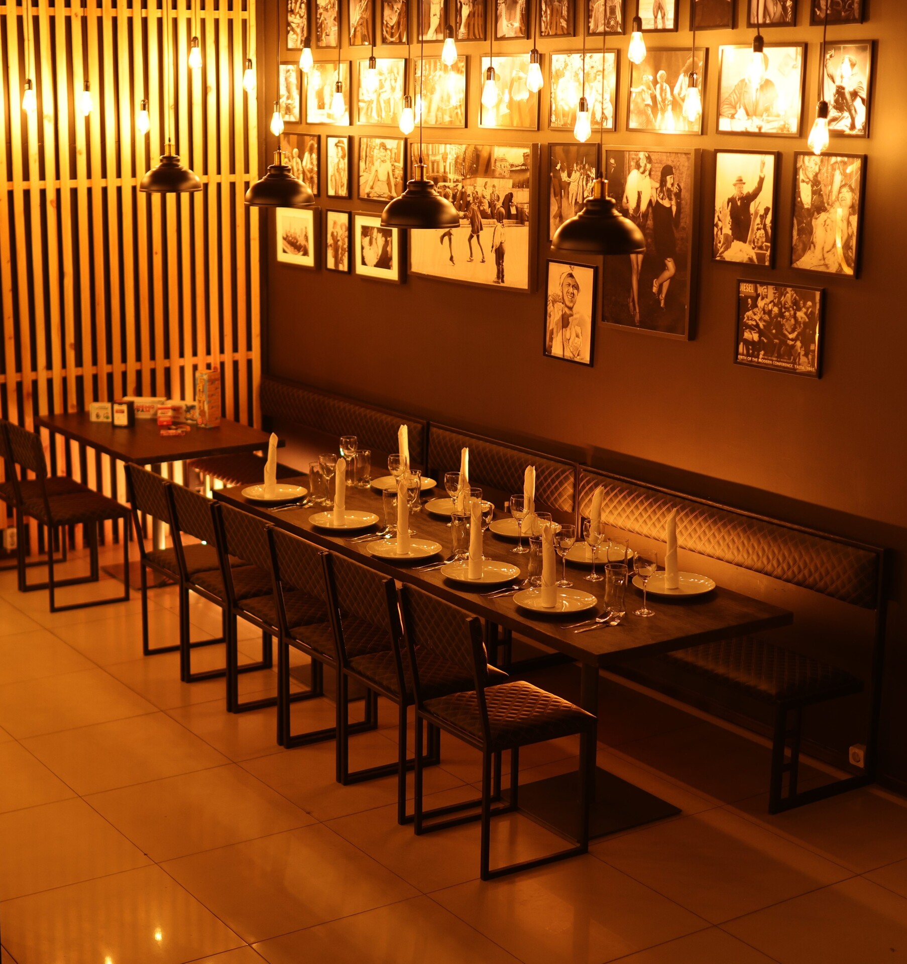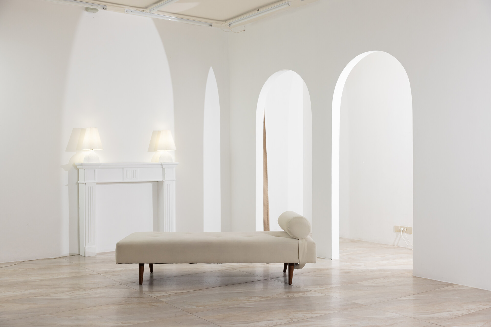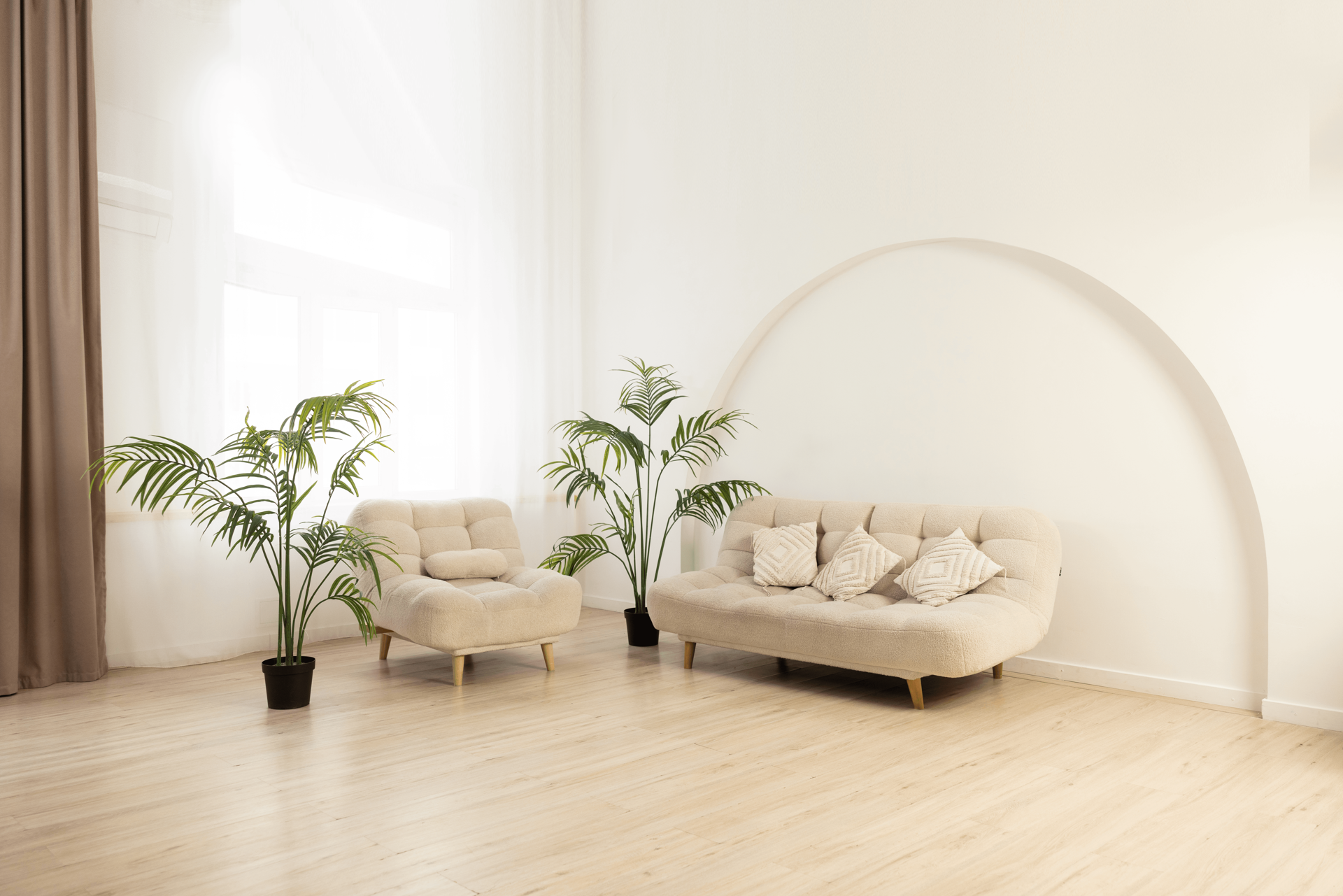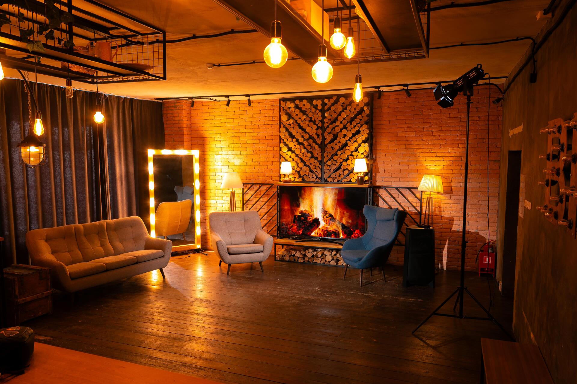 Светлый, просторный зал с интерьерными и текстурными фотозонами. Интерьер выполнен в светлых и темных оттенках. Часть зала спроектирована, как просторная квартира с кухней. Вторая часть — это стильная современная зона с двумя арками и большим количеством декоративных элементов.
