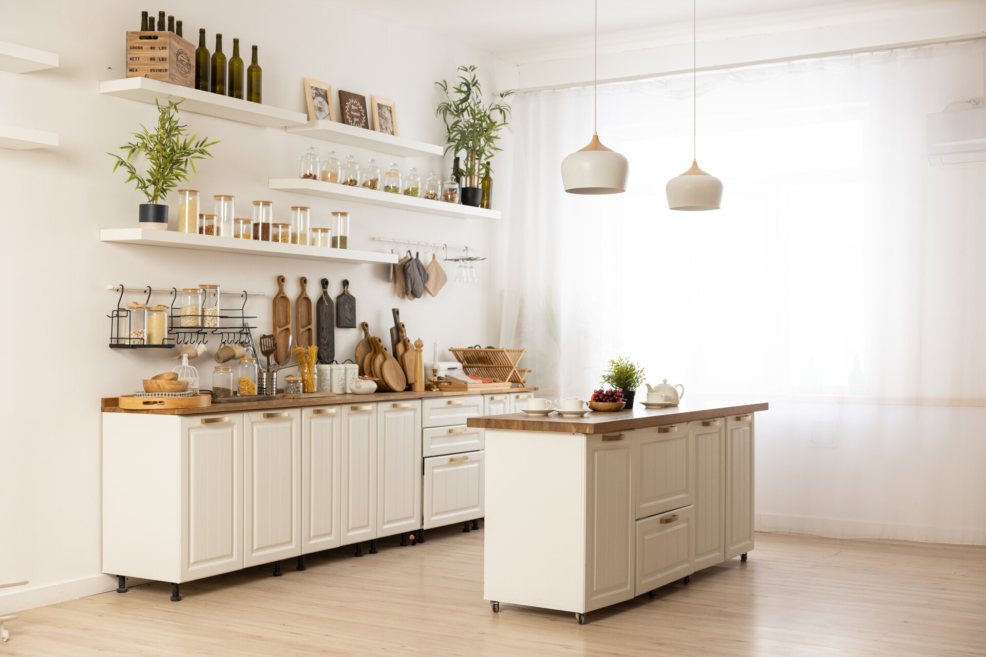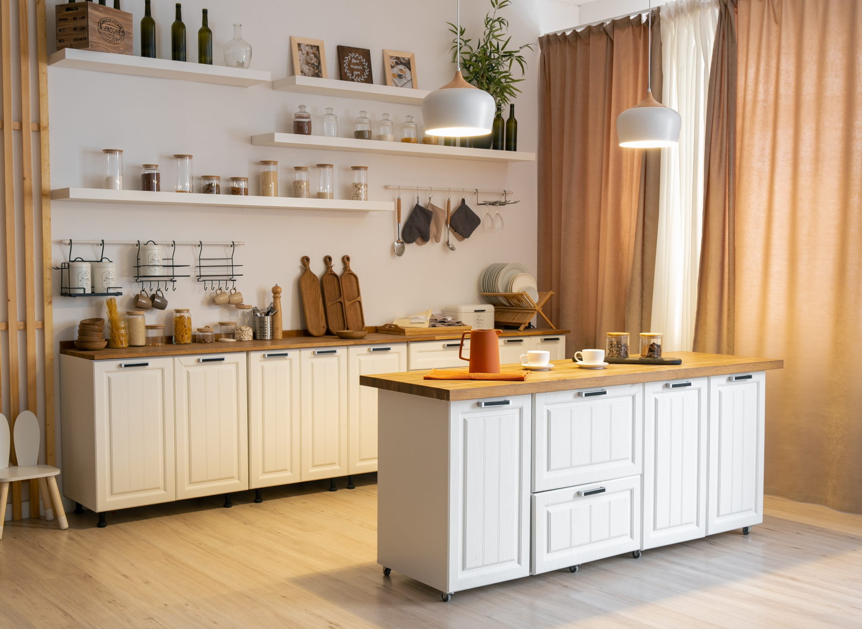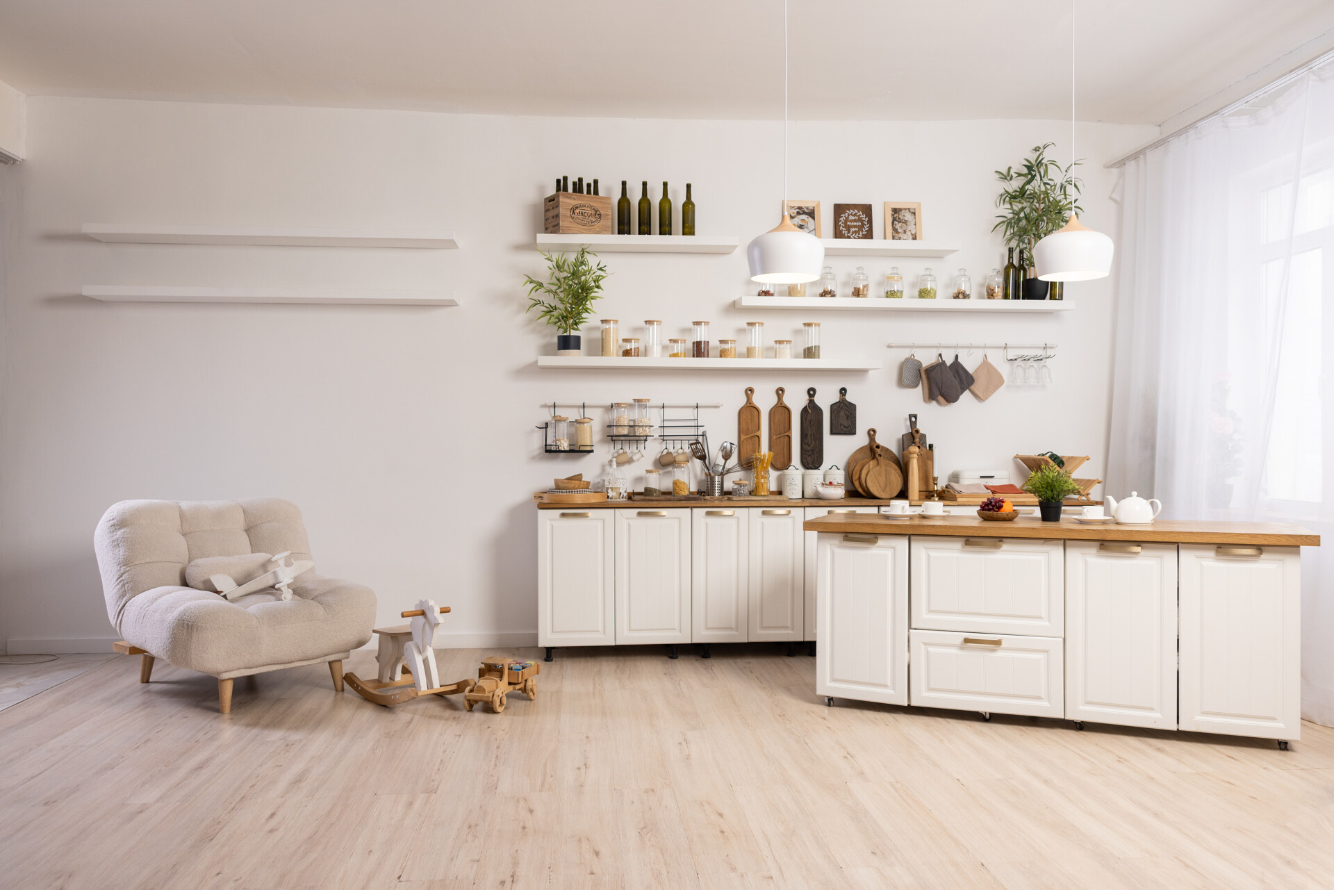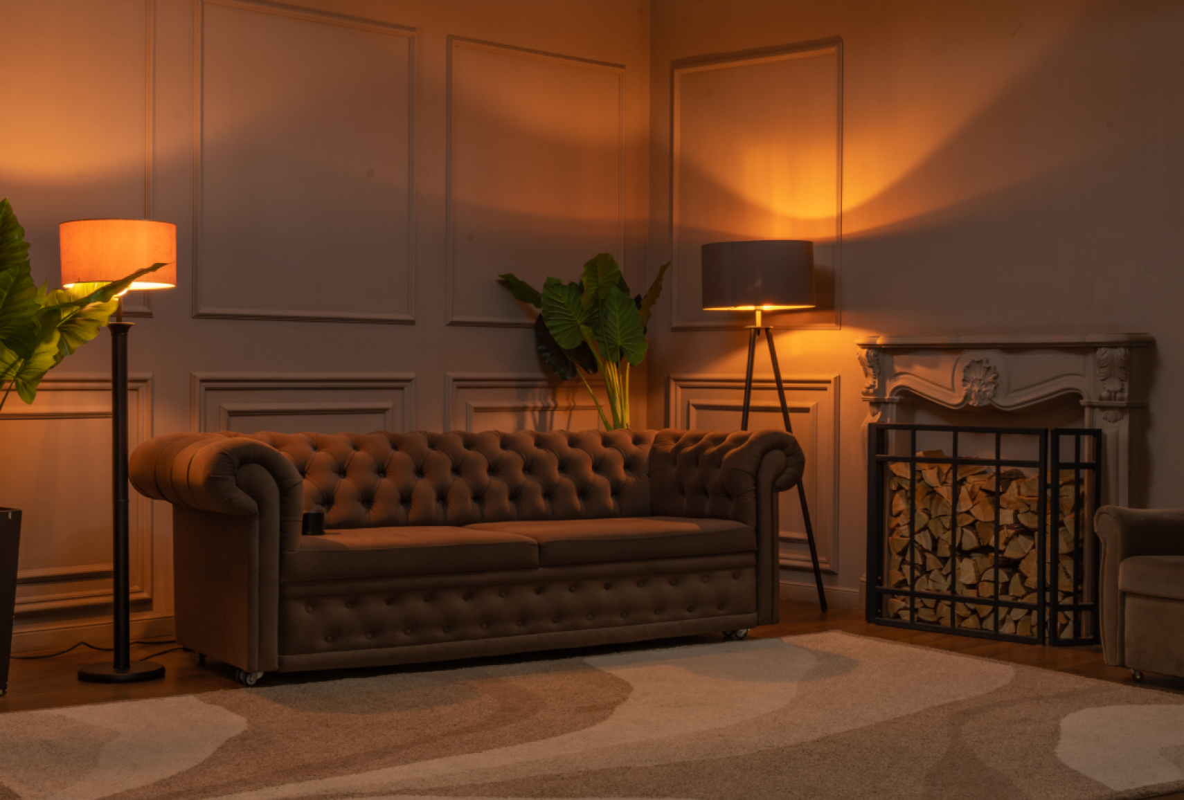 Светлый, просторный зал с интерьерными и текстурными фотозонами. Интерьер выполнен в светлых и темных оттенках. Часть зала спроектирована, как просторная квартира с кухней. Вторая часть — это стильная современная зона с двумя арками и большим количеством декоративных элементов.