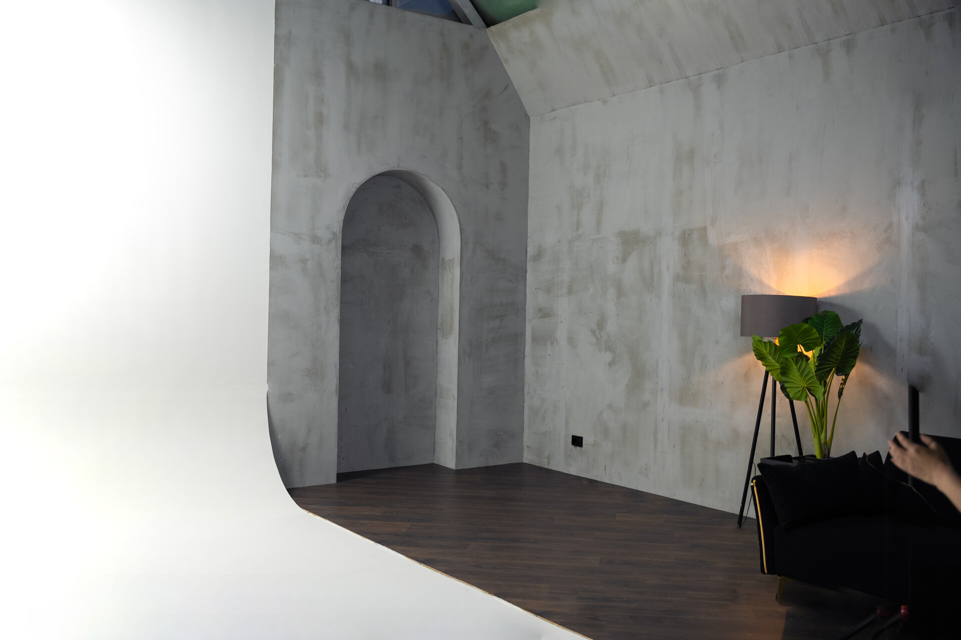 Светлый, просторный зал с интерьерными и текстурными фотозонами. Интерьер выполнен в светлых и темных оттенках. Часть зала спроектирована, как просторная квартира с кухней. Вторая часть — это стильная современная зона с двумя арками и большим количеством декоративных элементов.